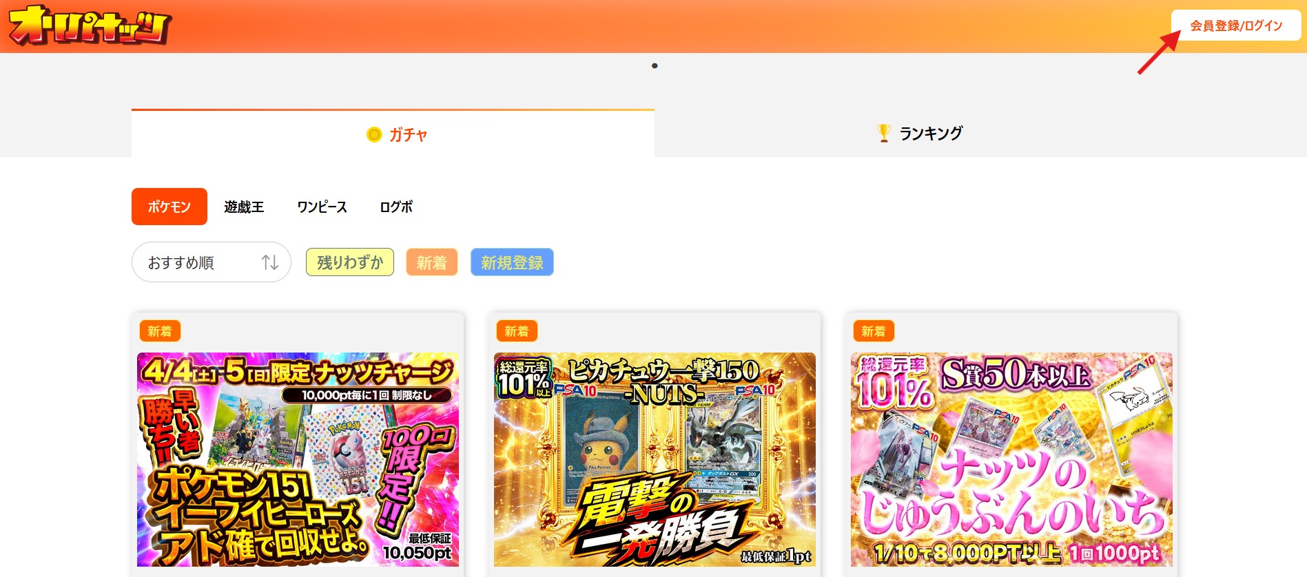 オリパナッツは2026年3月9日に新しく始まったばかりのオンラインオリパサイトです。