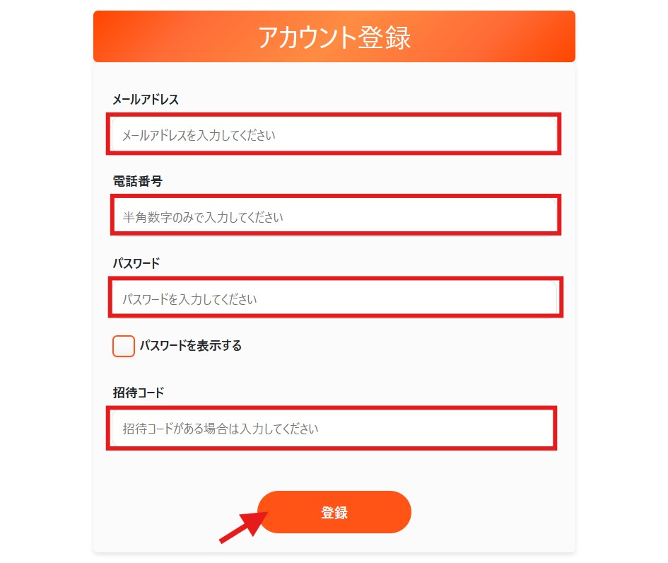 名前、電話番号、パスワード、さらに招待コードも入力します。
